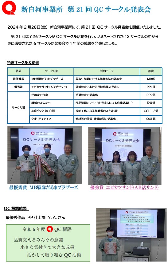 2024年2月28日(金) 新白河事業所にて、第21回 QCサークル発表会を開催いたしました。