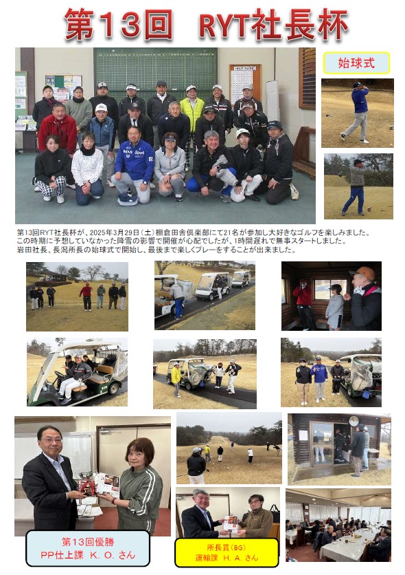 第13回RYT社長杯が、2025年3月29日(土)棚倉田舎倶楽部にて21名が参加し大好きなゴルフを楽しみました。
